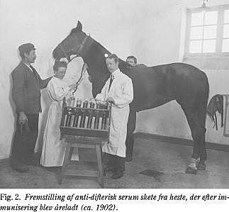I de første 20 år var Statens Serum Instituts arbejde præget af produktionen af terapeutiske antisera (Fig. 2 ), af opdagelsen af de sygdomsfremkaldende mikroorganismer og af fremkomsten af immunologiske metoder til diagnostik, fx Wassermann-reaktionen til diagnostik af syphilis. Under første verdenskrig var stivkrampen blandt sårede soldater et meget stort problem. Instituttet var her i stand til at levere så store mængder anti-tetanus-serum til de krigsførende lande, at instituttet var selvfinansierende og endda kunne overføre et overskud til statskassen.