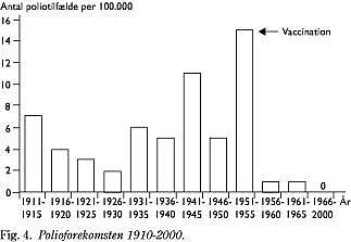 1950'erne blev vaccinationernes årti. I 1950 blev børnevaccinationsprogrammet indført og omfattede et tilbud om vaccination mod difteri, tetanus, kopper og tuberkulose. Børnelammelsesepidemien i 1952 og 1953 kom som et chok for den danske befolkning, og alle kræfter blev sat ind på udviklingen af en vaccine. I april 1955 kunne Statens Serum Institut tilbyde poliovaccination til børn i alderen 7-12 år (Fig. 4 ). Danmark var derved det første land i Europa og det andet land i verden - 13 dage efter USA - som kunne give dette tilbud, som 98% af børnene tog imod. I løbet af få år blev børnelammelsen udryddet i Danmark.