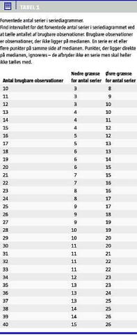 For få eller for mange serier: For få eller for mange serier tyder på »for lidt« eller »for meget« variation i forhold til, hvad man ville forvente, hvis processen var tilfældig. Intervallet for forventede antal serier findes ved opslag i Tabel 1 .