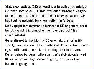 Summary Status epilepticus Ugeskr Læger 2004;166:3918-3922 Status epilepticus (SE) is defined as a condition in which epileptic seizures continue for 30 minutes or more or are repeated without recovery of consciousness between the seizures. Clinically, the most important types of SE are generalized tonic clonic SE, simple partial SE, complex partial SE and absence status. The incidence of SE is 50 per 100,000 per year, and the mortality rate is 22%. Generalized tonic clonic SE requires acute general treatment of the vital functions and consequences of SE. The specific antiepileptic treatment starts with benzodiazepine administered intravenously. If SE is not blocked efficiently by this treatment, intravenous administration of fosphenytoin, phenytoin, valproate or phenobarbital should be used. The last step in difficult cases is general anesthesia.