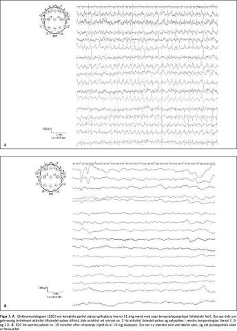 Kompleks partiel SE er en tilstand af SE med fokalt udgangspunkt og bevidsthedspåvirkning, oftest plumring [1, 2]. Herudover kan der ved kompleks partiel SE være motoriske, sensoriske og autonome symptomer samt påvirkning af sproget. Tilstanden kan vare minutter, timer eller dage, og den hører til de hyppigst forekommende former for SE. Diagnosen er ofte vanskelig at stille, fordi en række andre mulige årsager til bevidsthedsplumring må overvejes. Disse differentialdiagnoser omfatter absencestatus og andre anfaldsrelaterede tilstande som postiktal konfusion og bevidsthedsændring ved forekomsten i elektroencefalogram (EEG) af periodiske lateraliserede epileptiforme komplekser (PLEDS), om end visse forfattere opfatter PLEDS som et iktalt fænomen. Desuden kan bevidsthedspåvirkningen skyldes toksisk eller metabolisk encefalopati, hovedtraume eller vaskulær lidelse. Endelig kan forskellige psykiatriske forstyrrelser forveksles med epileptiske anfald med bevidsthedspåvirkning. Mistanke om kompleks partiel SE indicerer akut EEG, men uden for normal dagarbejdstid stilles diagnosen ofte ex juvantibus (ved virkningen af akut antiepileptisk medicinering). I Figur 1 vises EEG fra en patient i kompleks partiel SE hhv. før (A) og efter (B) behandling med diazepam givet intravenøst.