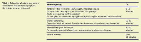 Den specifikke antiepileptiske behandling ved generaliseret konvulsiv SE skal afbryde den epileptiske anfaldsaktivitet hurtigt og effektivt. Der findes et stort klinisk erfaringsgrundlag vedr. behandlingen af denne tilstand, men der er kun få randomiserede undersøgelser, som tjener til anbefaling af bestemte behandlingsregimener eller præparater. Der er flere mulige antiepiletika at vælge mellem ved behandlingen af generaliseret konvulsiv SE. Tidsfaktoren er imidlertid afgørende, idet prognosen forværres med varigheden af SE. Det er derfor nødvendigt, at man på neurologiske og pædiatriske afdelinger har instrukser for behandling af denne tilstand. I Tabel 1 skitseres nogle behandlingsmuligheder, som forfatterne kan anbefale.