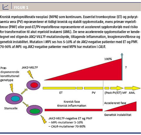 Vores viden om de molekylærpatologiske forandringer er øget markant de seneste ti år. Særligt er opdagelsen af mutationerne i generne for Janus kinase 2-V617F (JAK2-V617F) og calretikulin (CALR) et afgørende gennembrud. MPN-fænotyperne (ET, PV og PMF) opfattes i dag som et kontinuum med ET og PV repræsenterende det tidlige cancerstadium, mens PMF eller post-ET/PV myelofibrose med overgangsformer repræsenterer det avancerede cancerstadium med betydelig risiko for transformation til akut myeloid leukæmi (AML) (Figur 1) [1]. De sene accelererede sygdomsstadier (PMF og post-ET/PV MF) er kendetegnet ved stigende JAK2-V617F mutationsbyrde, tiltagende knoglemarvsfibrose og inflammation, som faciliterer genetisk instabilitet med erhvervelse af nye mutationer [4].