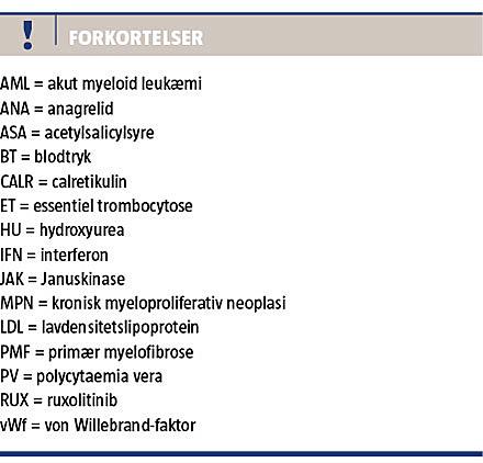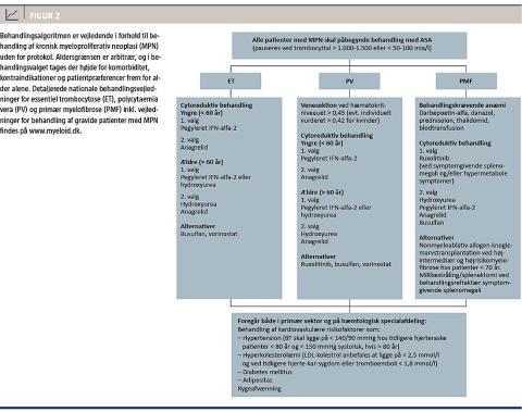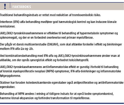 Sammenfattende konkluderes, at den traditionelle risikostratificering og behandlingsstrategi udfordres i disse år. I Danmark er vi i front i forhold til afdækning af potentialet for behandling med særligt IFN-alfa, dels som monoterapi, dels i kombination med JAK1/JAK2-kinasehæmmere og statiner. HU og ANA vil fortsat have en plads i behandlingen af MPN, særligt hvor