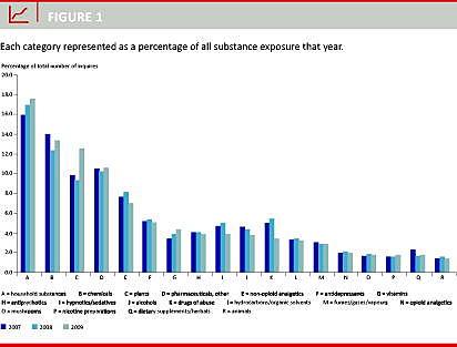 Overordnet viste der sig en stigning på 67% i antallet af kontakter og en stigning på 68% i antallet af rapporterede giftstofeksponeringer til 19.895 eksponeringer pr. år fra 2007 til 2009. I 2009 var der tre kontakter pr. 1.000 indbyggere i Danmark. I hver tiende forespørgsel var der mere end et agens involveret i forgiftningen. Fordelingen i de 18 hovedkategorier fremgår af Figur 1 . Forgiftningseksponeringer med lægemidler udgjorde en tredjedel af det samlede antal i de tre år, hvoraf fire tiendedele var psykofarmaka, og tre tiendedele var smertestillende medicin. Der fandtes relative stigninger blandt især husholdningsprodukter, planter og vitaminer over de tre år. Blandt de enkelte undergrupper fandtes en næsten tredobling af clozapins relative andel i kategorien af antipsykotika i perioden. Paracetamol var det enkeltstof, der var hyppigst repræsenteret med 4% af alle eksponeringer.