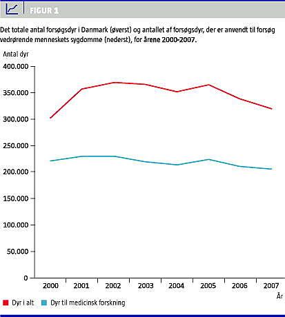 Det totale forbrug af forsøgsdyr har været nogenlunde konstant gennem de seneste syv år, idet det hvert år har udgjort ca. 350.000 forsøgsdyr ( Figur 1 ). I dette antal indgår dog også visse kliniske veterinære patienter (hunde og katte) fra Københavns Universitet (KU)/Det Biovidenskabelige Fakultet (LIFE). Men omvendt er der også et ukendt antal dyr, der juridisk set ikke er forsøgsdyr og derfor ikke indgår i statistikken, men som dog alligevel bliver aflivet af hensyn til forskningen. Det er eksempelvis dyr, hvor udtagne organer og væv skal bruges til in vitro-studier. Formålet med denne artikel er at gøre status over, hvad forsøgsdyrene i Danmark har været brugt til i perioden 2000-2007, herunder med særligt fokus på den del, der anvendes til forskning i menneskets sygdomme. De statistiske oplysninger stammer fra Dyreforsøgstilsynets årsberetninger for perioden 2000-2007 [1].