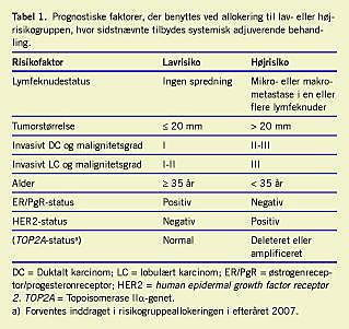 I det følgende vil vi gennemgå baggrunden for den enkelte risikofaktors brug som allokeringsredskab (Tabel 1 ) til systemisk adjuverende behandling og dens eventuelle prognostiske og prædiktive egenskaber.