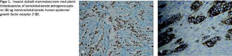 Tilstedeværelsen af østrogen- og progesteronreceptor påvises immunhistokemisk (Figur 1A ). Ca. 80% af alle mammakarcinomer er receptorpositive [7]. Tilstedeværelsen af receptorerne er knyttet til andre, prognostisk favorable faktorer som lav malignitetsgrad og negativ lymfeknudestatus, ligesom andelen af receptorpositive tumorer er stigende med stigende alder. Hormonreceptorerne (HR) er karakteriseret ved deres prædiktive værdi, idet ca. 60% af de HR-positive patienter har effekt af antiøstrogenbehandling.