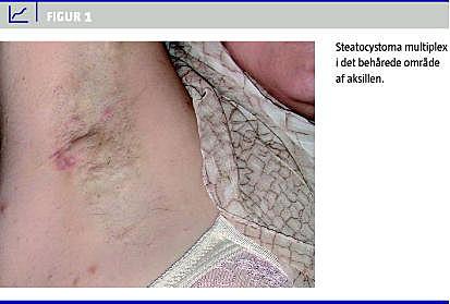 Summary Steatocystoma multiplex in 39 year-old female Ugeskr Læger 2011;173(33):1964-1965 A clinical case of the rare disorder steatocystoma multiplex is described in a 39-year-old female. The patient was diagnosed with generalized intradermal lesions that started presenting in early adulthood. There was no family history of similar lesions.Skin examination showed multiple, skin-coloured cystic lesions on the chest, abdomen, axillae and back. The patient's clinical presentations and history were compatible with steatocystoma multiplex. Various treatment options for steatocystoma multiplex and steatocystoma multiplex suppurativum have been published and include oral antibiotics, isotretinoin, excision and incision techniques.