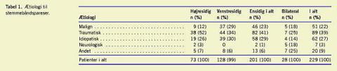 Patienterne i denne opgørelse blev udredt efter de vedtagne retningslinjer på vores afdeling. Det indebar almindelig otologisk undersøgelse med fokuseret kranienervegennemgang, fiberlaryngoskopi og/eller videostroboskopi. Blandt de patienter, hos hvem årsagen ikke umiddelbart var kendt, fik størstedelen foretaget røntgen af thorax, ultralydundersøgelse af halsen og CT eller magnetisk resonans-skanning af hals og mediastinum. Skopier i generel anæstesi blev foretaget på indikation, men ikke rutinemæssigt.