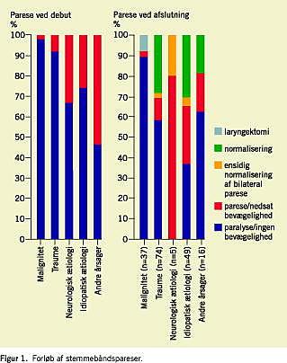 Kun en af vore patienter med SP på malign baggrund genvandt delvist stemmebåndsbevægeligheden. Derimod genvandt en betydelig del af patienterne med andre ætiologier helt eller delvist stemmebåndsbevægeligheden. Ved traumatisk betinget SP fik 28% normal stemmebåndsbevægelighed, hyppigst efter benign, ukompliceret kirurgi. 31% af de idiopatiske SP normaliseredes, og yderligere 6% af patienterne fik bedre stemmebåndsbevægelighed. Alle de neurologisk betingede SP havde delvis stemmebåndsbevægelighed ved afslutning af behandlingen, men de absolutte tal er små. Der mangler oplysninger om udfaldet af paresen hos godt en femtedel af patienterne. Det nøjagtige tidspunkt for normalisering (og dermed varigheden af SP) kunne kun sjældent angives præcist. Dels oplevede patienterne ofte ingen ændring i symptomerne, dels blev de kun kontrolleret hos os hver tredje eller sjette måned. Vi har som hovedregel fulgt patienter med vedvarende SP i et år, og der blev hos de fleste patienter påvist normalisering inden for dette tidsrum. For tre patienter konstaterede vi dog fortsat uændret parese 11 måneder fra symptomdebut og først normal bevægelighed efter mere end 12 måneder. Det drejede sig om to idiopatiske og et traumatisk tilfælde, alle var venstresidige.