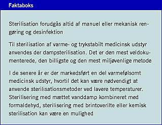 Summary Sterilisation methods Ugeskr Læger 2007;169(49):4246-4248 Manual or mechanical cleaning and disinfection should always be done prior to sterilisation. Steam under pressure sterilisation should always be preferred for items that can withstand heat and pressure variations. Heat-and pressure-sensitive medical devices can be sterilized with saturated water steam in combination with formaldehyde, plasma sterilisation or chemical sterilisation. Equipment for sterilisation should be purchased, tested, and maintained according to the manufacturer's recommendations and according to the standards covering the individual type.