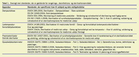 For alt apparatur, der anvendes i forbindelse med genbehandling af medicinsk flergangsudstyr, gælder det, at udstyret skal være CE-mærket og derfor omfattet af kravene i Det Medicinske Direktiv. Det betyder, at apparaturet skal anskaffes, testes, drives og vedligeholdes i overensstemmelse med fabrikantens anvisninger og i henhold til de standarder, der dækker det enkelte apparat (Tabel 1 ). Det betyder også, at man i forbindelse med anskaffelse skal sikre, at apparaturet installeres og valideres i overensstemmelse med kravene i den tilhørende standard. Opmærksomheden skal også henledes på, at der for nogle steriliseringsapparater skal foretages rutinemæssige test, såsom Bowie & Dick-test og lækagetest. Apparater skal derudover underkastes forebyggende regelmæssige serviceprogrammer og revalideres hver 12. måned. Herved sikres, at man med apparatet fra ibrugtagning til kassation kan gennemføre effektive processer.
