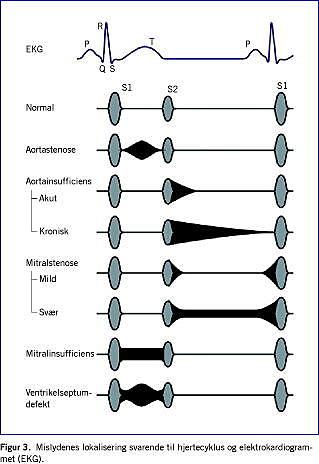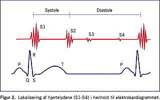 Figur 2 viser hjertelydenes lokalisation i forhold til elektrokardiogrammet.