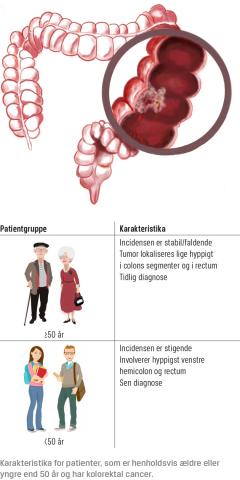 I nyere undersøgelser er der rapporteret en stigende incidens af yngre patienter med kolorektal cancer i flere vestlige lande, heriblandt Danmark [1, 2]. Samtidig har incidensen for ældre patienter med samme diagnose været faldende [2]. Yngre patienter (< 50 år) udgør ca. 10% af alle diagnosticerede tilfælde af kolorektal cancer i USA, mens de kun udgør 3,2% i Danmark [2, 3]. En undersøgelse viser, at ca. 70% af alle patienter under 40 år med kolorektal cancer har sporadisk sygdom [4]. Sygdomsstadiet er oftest mere avanceret hos yngre patienter end hos ældre, hvilket gør tendensen endnu mere bekymrende [4, 5].