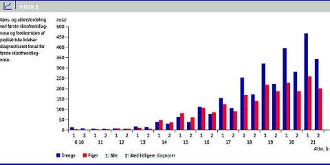 Introduktion: Formålet var at øge forståelsen af skizofreniudvikling hos børn og unge. Der blev foretaget en alders- og kønsspecifik analyse af børn og unge, som fik diagnosticeret skizofreni. Analysen indeholdt beregninger af incidensraten for skizofreni, skizofreniundertyper og opgørelse af registrerede psykiatriske diagnoser forud for første skizofrenidiagnose.