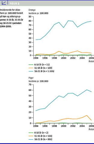 Incidensraten for skizofreni var i perioden 1994-2006 stigende for alle aldersgrupper og mest udtalt i aldersgruppen 11-15 år (Figur 2). For drenge var stigningen fra 1994 til 2006 på fire fold for den mellemste aldersgruppe imod en tofoldsstigning for den ældste aldersgruppe, og for piger var forholdet henholdsvis en syvfoldsstigning imod en trefoldsstigning. I alle aldersgrupper var incidensraten for drenge 25-30% højere end for piger. Denne relative forskel var stort set uændret i perioden 1994-2006 i alle aldersgrupper. Den største stigning i de alders- og kønsspecifikke incidensrater forekom i perioden 1994 til 2001, hvorefter stigningen var beskeden. Ved brug af Poisson-regression til analyse af incidensrater i perioden 1994-2006 blev der fundet signifikante forskelle imellem de tre aldersgrupper (χ2 (2) = 1.353,5; p < 0,0001), mellem køn (χ2 (12) = 136,7; p < 0,0001) og imellem årerne (χ2 (1) = 82,8; p < 0,0001). Ved brug af multipel Poisson-regression fremstod alder (χ2 (2) = 1.391,4; p < 0,0001), køn (χ2 (1) = 84,9; p < 0,0001) og år (χ2 (12) = 223,2; p < 0,0001) som signifikante, selvstændige, forklarende variable for incidensraten.