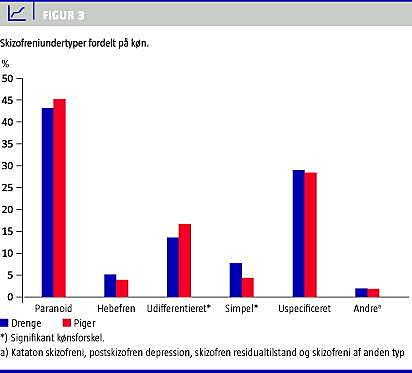 I perioden 1994-2007 var den hyppigste skizofreniundertype for begge køn paranoid skizofreni (F20.0; 44,0%), efterfulgt af uspecificeret skizofreni (F20.9; 28,7%) og udifferentieret skizofreni (F20.3; 14,7%) (Figur 3). Udifferentieret skizofreni forekom signifikant hyppigere hos piger (p = 0,022), og simpel skizofreni forekom signifikant hyppigere hos drenge (p < 0,0001). For de øvrige skizofreniundertyper var der ingen kønsforskelle.