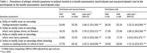 Prævalensen af symptomer på allergisk rhinitis steg ligeledes signifikant fra 1990 til 1998 (Tabel 1). Denne stigning var kun lidt højere blandt deltagerne i helbredsundersøgelsen sammenlignet med stigningen blandt alle, som var inviteret til helbredsundersøgelsen (både deltagere og ikkedeltagere).