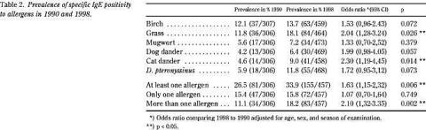 Resultater: Prævalensen af specifikt IgE imod mindst ét af seks allergener steg signifikant fra 1990 til 1998 (26,5% versus 33,9%, og alders-, køns- og sæsonjusteret odds ratio var 1,63, 95% CI 1,15-2,32). Ændringer i prævalensen af forskellige livsstils- og miljøfaktorer syntes ikke at kunne forklare denne stigning. En samtidig stigning i prævalensen af symptomer på allergisk rhinitis understregede den kliniske betydning af stigningen i specifikt IgE.