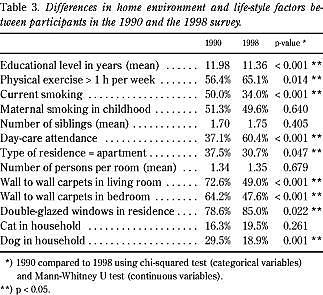 Oplysninger om livsstil og boligforhold blev indhentet med identiske spørgsmål i de to undersøgelser. Potentielle, forklarende varia ble blev defineret: antal års uddannelse, motion (mere end en time per uge), rygning (aldrig-ryger, tidligere ryger, ryger), moders rygning i deltagerens barndom, antal søskende, antal år i børneinstitution (før 5-års-alderen), boligtype (lejlighed, hus, andet), antal personer per rum i bolig, væg til væg-tæpper, termoruder i boligen, for tiden eller tidligere kat eller hund i boligen.