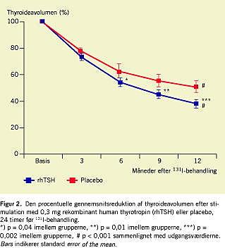 Summary Stimulation with 0,3 mg recombinant human thyrotropin (rhTSH) increases the effect of 131 I therapy in patients with nontoxic nodular goiter. A prospective, randomized, double-blind trial - Secondary publication Ugeskr Læger 2006;168(47):4098-4101 In a randomized, double-blind, placebo-controlled trial, 57 patients with nontoxic nodular goiter were stimulated with either 0.3 mg recombinant human thyrotropin (rhTSH) or placebo before radioactive iodine (131 I) therapy. After one year the goiter reduction had improved by 35% compared to conventional 131 I therapy. The difference was most pronounced in patients with a large goiter. Adverse effects, including development of permanent hypothyroidism, were significantly more frequent in the rhTSH group. Patient satisfaction was high and uninfluenced by the use of rhTSH.