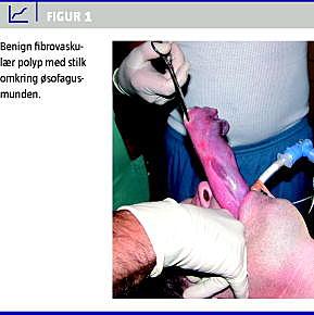 Summary Large fibrovascular polyp in the oesophagus Ugeskr Læger 2011;173(44):2802-2803 We describe a 45 year-old man with a fibrovascular polyp attached to the entrance of the oesophagus. The patient had a history with regurgitation of polypose foreign body 4-5 years ago with spontaneous remission. Later the patient developed dysphagia, chest pain and weight loss. Gastroscopy revealed a large polyp in the oesophagus and biopsies showed no malignancy. Excision was intended to be performed endoscopically, but due to size, risk of bleeding and recurrence the operation was changed to a transcervical procedure. After one week the patient could eat and drink normally.