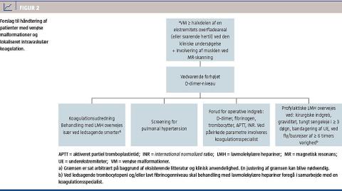 Der er i dag ingen klare retningslinjer for udredning for tromboemboli og pulmonal hypertension hos patienter med ekstensive VM. Der er dog i litteraturen stigende fokus på problemstillingen, og det anbefales, at D-dimer anvendes i den medicinske evaluering af patienter med ekstensive VM [1, 2, 15-18]. Måling af både D-dimer og fibrinogen anbefales desuden forud for operative indgreb hos patienter med ekstensive VM for at foregribe, at en eventuel LIC uvikler sig til en dissemineret koagulationsforstyrrelse [1, 2, 15-18].