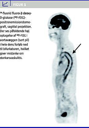 På PET-skanningen ( Figur 1 ) sås en høj optagelse af 18 F-FDG i aortavæggen helt fra aortaroden ned til aortabifurkaturen, hvilket er foreneligt med storkarsvaskulitis. I øvrigt var der ingen patologisk aktivitetsoptagelse. En ledsagende diagnostisk CT viste moderat aortaektasi og stort set ingen arteriosklerose. Patienten havde ingen kranielle symptomer, og biopsi af arteria temporalis viste inflammatoriske forandringer, dog uden klassiske kæmpeceller. Det blev konkluderet, at patienten formentlig led af kæmpecellearteritis med involvering af aorta, evt. Takayasus arteritis. Der blev initieret peroral behandling med glukokortikoid, hvorefter patienten rettede sig markant såvel klinisk som biokemisk.
