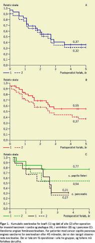 Mortalitet før 30. dag eller inden udskrivelsen, morbiditet, postoperativ indlæggelse (Tabel 1 ) og den kumulative overlevelse, dels for den totale dødelighed, dels for kræftbetingede dødsfald (Figur 1) blev brugt som parametre. I Tabel 1 er der tillige anført resultaterne fra tidligere publikationer om samme emne fra de landsdelsafdelinger, hvor man havde udført flest af de pågældende operationer [1-5].