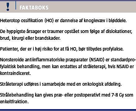 Heterotop ossifikation (HO), også kendt som paraartikulær ossifikation, er en benign tilstand, som skyldes dannelse af knoglevæv i bløddelsvæv. HO er et velbeskrevet klinisk problem, som kan forekomme efter neurologisk skade og være arveligt betinget, men den hyppigste årsag er traume, bl.a. som følge af dislokationer, brud, kirurgi eller brandskader (Figur 1). Tilstanden er karakteriseret af indskrænket bevægelighed med eller uden smerte afhængigt af graden. Varierende profylaktiske behandlinger er forsøgt for at begrænse udviklingen af HO for patienter i risikogruppen, men kun postoperativ profylakse med nonsteroide antiinflammatoriske præparater (NSAID) eller lokal stråleterapi (ST) har vist sig at være effektive [].