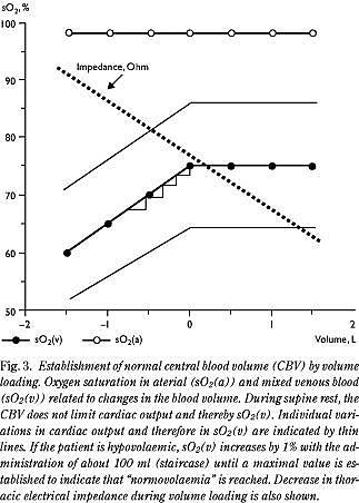 Det er ønskeligt at kunne detektere en reduktion i CBV, der er mindre end den, der udløser et hypovolæmisk shock. De fleste tåler et blodtab på en halv liter, men ca. halvdelen af befolkningen besvimer ved et blodtab på omkring en liter. Tolerancen for blødning vil dog være mindre, hvis lejring og anæstesi har reduceret CBV. Med CO eller SvO2 kan væskebehandlingen præciseres. I liggende stilling etableres en normovolæmisk tilstand ved at øge CBV, indtil et maksimalt CO eller en maksimal SvO2 er etableret (2, 23). Da blodets saturation kan måles med en nøjagtighed på 1%, og SvO2 stiger ca. 1% ved administration af 100 ml (2, 23), bliver 100 ml usikkerheden i at sikre en »normovolæmisk« tilstand.