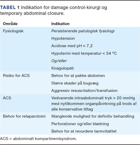 Damage control-kirurgi (DCS) har ophav i traumekirurgien og er senere adapteret til resten af det akutkirurgiske område. Strategien indebærer kortvarig (< 60 min) stabiliserende kirurgi til fysiologisk svært ustabile patienter. Abdominal DCS involverer oftest hæmostatiske procedurer og håndtering af perforerede hulorganer, efterfulgt af behandling af et organsvigt på et intensivt afsnit. Beslutningen om at udføre DCS træffes på baggrund af et traumes omfang og/eller patientens fysiologisk tilstand. Det estimeres, at der i ca. 10% af de alvorlige traumer vil kunne profiteres af DCS [10]. En entydig kategorisering af patientgrupper, der profiterer af DCS, er ikke defineret, men nogen konsensus forefindes (Tabel 1) [4]. Da der ved DCS ikke udføres definitiv kirurgi, er der indikation for at anvende TAC.