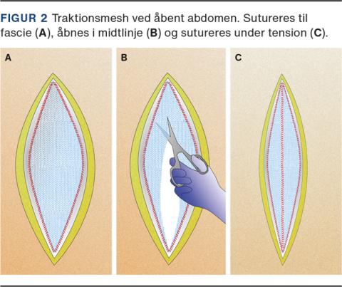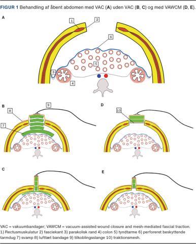 I Danmark udføres der årligt ca. 3.500 akutte åbne abdominale operationer (laparotomi). Ætiologien kan overordnet inddeles i infektion, perforation, obstruktion, iskæmi og blødning [1]. Størstedelen af indgrebene er primære, mens 10-20% er reoperationer pga. komplikationer [2]. Oftest er patienten færdigbehandlet efter første indgreb (definitiv kirurgi), men i 1-2% af operationerne kan patienten ikke færdigbehandles ved første indgreb, og yderligere operationer er nødvendige. Her er der behov for at lade abdomen forblive åbent imellem indgrebene, og hverken fascie eller hud lukkes i abdominalincisionen (laparostomien). Indikationerne for åbent abdomen kan groft inddeles som følger [3, 4]: 1) svært ustabil fysiologi hvor der er behov for kortvarig kirurgi (damage control-strategi), 2) behov for at revurdere de intraabdominale forhold efter første operation (second look-strategi) og 3) manglende mulighed for at lukke abdomen (f.eks. ved stor fasciediastase efter fascieruptur eller ved mistanke om/risiko for abdominalt kompartment).