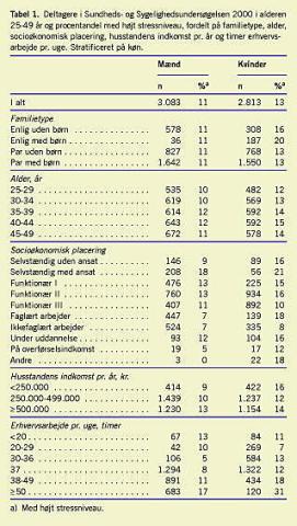 11% af mændene og 13% af kvinderne rapporterede, at de ofte var stressede i dagligdagen (Tabel 1). De grupper, der rapporterede om mest stress, var mænd og kvinder, der var selvstændige med ansatte og havde mere end 50 timers arbejde om ugen. Mænd, der var 35-44 år, og boede i en husstand med en samlet indkomst på ≥ 500.000 kr. havde højest stressrapportering. De mest stressede grupper blandt kvinderne var enlige med børn, kvinder på 40-44 år, og kvinder, der angav husstandens indkomst til < 250.000 kr.