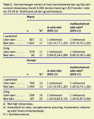 Materiale og metoder: Sundheds- og Sygelighedsundersøgelsen 2000 dannede baggrund for analyserne, hvor stress blev målt ved et spørgsmål om deltagerens følelse af stress i dagligdagen. I alt 3.083 mænd og 2.813 kvinder i alderen 25-49 år blev inkluderet. Analyserne blev stratificeret på køn og samlivsstatus, og der blev kontrolleret for alder, socioøkonomisk placering, indkomst og antal timers erhvervsarbejde.