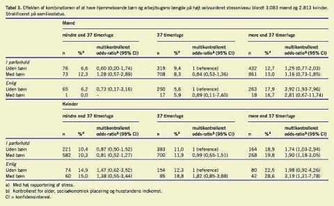 Resultater: Der var ingen forskel i rapporteringen af stress hos mænd og kvinder med og uden børn. Enlige kvinder, der både havde børn og en arbejdsuge på mere end 37 timer, havde et højere stressniveau (odds-ratio: 3,2, 95% konfidensinterval: 1,3-7,8) end enlige kvinder uden børn og en arbejdsuge på 37 timer.