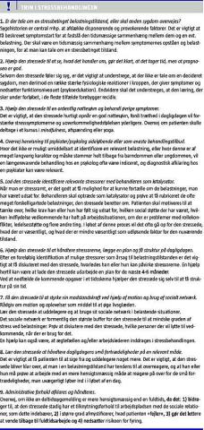 Erfaringerne fra disse undersøgelser og Sundhedsstyrelsens anbefalinger kan konkretiseres i følgende: Behandlingen af den stressede har flere trin. Det er vigtigt at vurdere, hvor i forløbet patienten er. Initialt vil mange være i en krisefase, hvor fokus bør ligge på udredning, behandling af umiddelbare symptomer og håndtering af evt. sygemelding. I en senere afklaringsfase vil man kunne gå i dybden med årsager og handlemuligheder, mens man først efter nogle uger når en handlingsfase, hvor patienten realiserer de tiltag, der skal bringe hende tilbage til sit tidligere funktionsniveau.