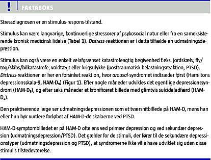 Det er HAM-D med de tre delskalaer A, B, C (Figur 1), der psykometrisk set bedst beskriver distress -reaktionen efter såvel udmatningssyndromet som PTSD [1]. Netop dette, at lægerne er i stand til at omrokere de 17 symptomer i Figur 1 under et Hamil-ton-interview, er i overensstemmelse med den common sense -filosofi, der blev grundlagt i England, da Hamilton var i færd med at konstruere depressionsskalaen [15]. Dette, at de stressramte patienter kan fornemme, at lægen er: »thoroughly familiar with the kind of illness that confronts them, that he or she knows the kind of feelings and thoughts that it brings to the patients« , sikrer et begyndende kompliant behandlingsforløb [16]. Det er således HAM-D, der er det egentlige psykometriske stressdiagnoseinstrument, når det skal afgøres, om der er primær eller sekundær depression [17].
