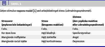 Inden for den kliniske stressforskning er det Selyes stimulus-respons-model [1], der har været det bærende princip (Tabel 1 ). Oprindeligt var Selye [2] mest optaget af de rent biologiske reaktioner fra kroppens side, specielt kortisol, men i hans sidste publikation [3] var psykens respons (distress ) medinddraget. Hvad angår selve stimulus, har Selyes model (Tabel 1) især fokuseret på langvarige, kontinuerlige, men ikke i sig selv livstruende belastninger (stressorer) enten af psykosocial natur eller fra en sameksisterende kronisk medicinsk lidelse [3].