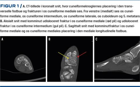 Efter to besøg hos egen læge blev hun henvist til en ny vurdering på skadestuen, da der ikke var bedring, og hun ikke kunne støtte på foden. Hun kunne nu supplere sygehistorien med, at hun følte/hørte et smæld i sin venstre fod, da hun gik ud på halgulvet. Nye røntgenbilleder rejste mistanke om fraktur i os naviculare. En CT af foden viste en komminut, udisloceret fraktur i os cuneiforme mediale med intakte ledrelationer og en udisloceret fraktur i os cuneiforme intermedium (Figur 1). Det blev tolket som et træthedsbrud, da der intet forudgående traume havde været. Ved en efterfølgende uddybende anamneseoptagelse viste det sig, at kvinden var politiaspirant og i forbindelse med optagelse på politiskolen halvandet år tilbage var begyndt at træne 4-5 gange ugentligt i et fitnesscenter. På politiskolen fik hun skemalagt fysisk træning 3-4 gange ugentligt, mens hun forsatte sin egen træning.