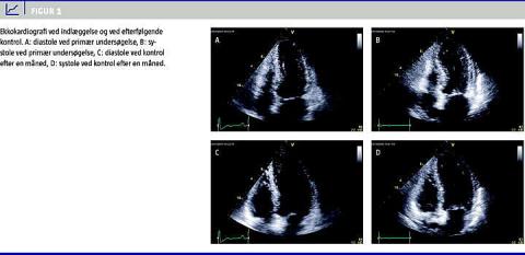 En 66-årig kvinde blev indlagt første juledag på mistanke om nyligt ST-elevationsmyokardieinfarkt (STEMI). Hun var disponeret til iskæmisk hjertelidelse ved rygning, let overvægt, statinbehandlet hyperkolesterolæmi og familiehistorie. Aftenen før indlæggelsen opstod der akut trykken i brystet i relation til stort familiært stress under julehøjtiden. Brystsmerterne bestod i ca. syv timer, hvorpå patienten følte sig træt og mat. Ved indlæggelsen ca. at halvt døgn efter smerteophør var patienten upåvirket og klinisk velkompenseret. EKG viste signifikant ST-elevation i prækordialafledningerne med efterfølgende udvikling af negative T-takker i disse afledninger. Blodprøverne viste, at CK-MB var faldende fra 27 mikrogram/l (normal < 5 mikrogram/l), og at troponin I var faldende fra 9,01 mikrogram/l (normal < 0,50 mikrogram/l). Ekkokardiografi ved indlæggelsen viste apikal ballonering og en estimeret uddrivningsfraktion (ejection fraction , EF) på 30% (Figur 1 ). Venstre ventrikel var ikke dilateret, og der var ingen signifikant klappatologi eller udløbsobstruktion. På baggrund af de kliniske fund og tidsforsinkelsen fra smertedebut fandtes der ikke indikation for akut KAG. Patienten blev behandlet med lavdosis-acetylsalicylsyre, clopidogrel, statinpræparat, betablokker og angiotensin converting enzyme (ACE)-hæmmer. I første indlæggelsesdøgn sås en enkelt asymptomatisk episode med nonsustained ventrikulær takykardi. Det kliniske forløb var derpå stabilt, og KAG på anden indlæggelsesdag viste lette diffuse forandringer uden angiografiske tegn til ustabile koronarplaques. Patienten blev udskrevet i velbefindende fire dage efter indlæggelsen under diagnosen AMI recens. Ved ambulant kontrol efter en måned var patienten i velbefindende, og ekkokardiografi viste fuldstændigt normaliserede forhold med normal EF (Figur 1). På baggrund af det samlede forløb blev diagnosen herefter revideret til TK.