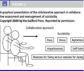 CAMS består af en særlig terapeutisk tilgang og et sæt specifikke kliniske procedurer. Suicide Status Form (SFF) er en integreret del af CAMS. SFF anvendes til at vejlede den kliniske vurdering, behandling og opfølgning hos patienter med selvmordsrisiko. SSF indeholder både en Likert-skala og åbne spørgsmål vedrørende patientens oplevelse af de fem såkaldte suicidale markører: »psykologisk smerte«, »stress«, »indre uro«, »håbløshed« og »selvhad«. Skemaet udfyldes af patient og behandler i fællesskab, hvilket understøtter den stærke terapeutiske alliance, som er central i CAMS (Figure 1 ). Metoden har ligeledes fokus på at øge patientens egen motivation i forhold til nye mestringsstrategier og genvindelse af håb.