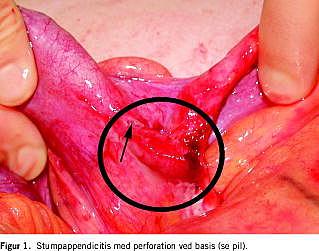 Der blev foretaget eksplorativ laparotomi med nedre midtlinjeincision med fund af stumpappendicitis samt spredte fibrinbelægninger. Appendixstumpen var 2 cm med perforation ved basis (Figur 1 ). Appendixstumpen blev reseceret centralt for perforationen og forsænket. Histologien viste akut nekrotiserende inflammation. Patienten blev udskrevet tre dage postoperativt i velbefindende.