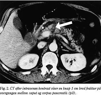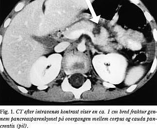 1. En syvårig pige blev indlagt få timer efter et styrt på cykel. Cykelstyret havde ramt den øvre abdomen, og patienten klagede ved indlæggelsen over smerter i epigastriet. Objektivt var hun let smertepåvirket, blodtrykket var på 100/80 mmHg og pulsen på 100. I epigastriet fandtes der et kontusionsmærke, men abdomen var uden diffus peritonealia. Initial UL-scanning viste normale forhold. S-amylase blev ikke undersøgt initialt. Seksten timer efter traumet forværredes tilstanden med hyppige alimentære opkastninger, febrilia (38,2°C), takykardi (120) og S-amylase >4.100 U/l. En fornyet UL-scanning viste fri væske i fossa Douglassi, men fortsat ingen organlæsion. Derimod viste efterfølgende dynamisk CT (Fig. 1), at pancreas var diffust ødematøst for-størret og med ansamling i det peripankreatiske rum, samt at der var en fraktur af pancreas i corpus cauda-overgangen. De øvrige organer var normale. Ved laparotomi fandtes der et hæmatom i mesocolon ud for en subtotal lodret ruptur i corpus pancreatis med overrevet ductus pancreaticus major. Der blev foretaget resektion af den distale del af pancreas. Det postoperative forløb var ukompliceret.
