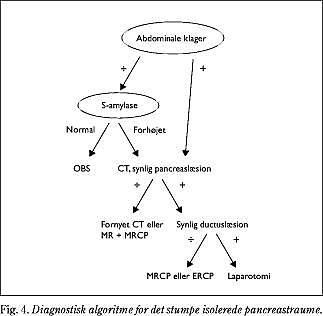 Konklusivt må det anbefales, at der ved relevant abdominalt traume og/eller ved mindste mistanke om pancreaslæsion foretages en undersøgelse ud fra følgende diagnostiske algoritme (Fig. 4). S-amylase måles hos patienter, hos hvem der er mistanke om pancreaslæsion. Ved abdominale symptomer og/eller forhøjet S-amylase foretages der akut dynamisk CT. Ved normal pancreas gentages såvel måling af S-amylase som CT, evt. suppleret med MRCP inden for det første døgn, hvis der stadig er mistanke om pancreaslæsion. Hos patienter med tegn på læsion af ductus pancreaticus foretages akut laparotomi. Hvis CT'en ikke viser umiddelbart tegn på læsion af ductus pancreaticus foretages MRCP, evt ERCP. UL-scanning kan anvendes til diagnostik af de hyppigste komplikationer.