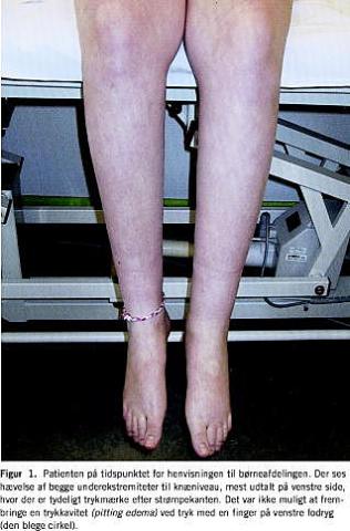 En 11-årig, tidligere rask pige blev henvist til børneafdelingen pga. tiltagende hævelse gennem ca. en måned af fødder, ankler og underben, mest udtalt på venstre side. Hun havde ingen symptomer i øvrigt, og der var ingen arvelige sygdomme i familien. Ved en objektiv undersøgelse fandtes der let ødem af tæer, fødder, ankler og underben, mest udtalt på venstre side (Figur 1 ). Blodprøver viste følgende normale værdier: rødt og hvidt blodbillede, trombocytter, koagulationsfaktorer, aktiveret partiel tromboplastin-tid, fibrin-D-dimer, elektrolytter, kreatinin, karbamid, albumin, C-reaktivt protein og SR. En ultralyd(UL)-skanning af abdomen fra diaphragma til bækkenbund viste normale forhold, specielt var der ingen rumopfyldende processer. En Doppler-UL-skanning af ingvinae viste normale vener med normal blodgennemstrømning. En røntgenundersøgelse af thorax viste normale forhold.