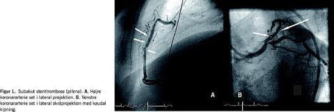En 61-årig mand blev indlagt med AKS. Han havde erkendt PV, hypertension og artritis urica og havde tidligere haft mavesår. Han havde ikke tidligere haft tromboemboliske episoder, og hæmatologien havde været stabil over en årrække under behandling med hydroxyurea. Ved indlæggelse var hæmoglobin-B-, hæmatokrit- og trombocyttallene inden for normalområdet. Et elektrokardiogram (ekg) viste ingen signifikante forandringer og plasma (P)-kreatinkinase isoenzym MB (CK-MB)-fraktion og P-troponin T var ikke forhøjede. En ekkokardiografi viste en normaldimensioneret, velfungerende venstre ventrikel. Patienten blev behandlet med nitroglycerin, enoxaparin, aspirin og simvastatin, mens man primært undlod behandling med clopidogrel pga. forventet øget blødningsrisiko. Efterfølgende var hans tilstand ustabil i flere dage. En koronarangiografi viste nonsignifikant venstre hovedstammesygdom, okklusion af det andet segment af højre koronararterie (RCA) og stenose på første segment af ramus decendens anterior (LAD). Efter forbehandling med clopidogrel (300 mg efterfulgt af 75 mg i tre dage) blev der udført PCI med standarddosis ufraktioneret heparin (70 IU/kg legemsvægt) og implantation af en 4 × 18 mm almin-delig metalstent (Bx Sonic) i RCA og en 3 × 23 mm sirolimusafgivende stent (Cypher Select) i LAD. Begge stent blev implanteret ved 12 atmosfæres inflationstryk, og det afsluttende angiogram viste tilfredsstillende forhold og ingen tegn på koronardissektion, reststenose eller trombe. En kontrolundersøgelse med intrakoronar ultralyd var ikke tilgængelig. Proceduren varede en halv time, og blodstørkningstiden blev ikke målt undervejs. Ved procedureafslutning blev indførings-sheath i a. femoralis fjernet med en lukkeanordning, og der blev ikke givet protaminsulfat. To timer efter proceduren opstod der brystsmerter og ekg-forandringer, som svandt ved behandling med nitroglycerin, men otte timer efter første PCI fik patienten persisterende brystsmerter og forbigående ST-segment-elevationer. Akut koronar angiografi viste SST i begge de stentede koronarkar (Figur 1 ). Efter påbegyndelse af i.v. infusion med glykoproteinhæmmeren abciximab blev der foretaget re-PCI. Operatøren valgte at foretage fornyet stentimplantation på mistanke om subangiografisk dissektion ved stentkanterne. I RCA blev der distalt og proksimalt med overlapning til den første stent implanteret henholdsvis en 4 × 13 mm metalstent (Bx Sonic) og en 4 × 8 mm metalstent (Bx Sonic). I LAD blev der indsat en 3 × 28 mm sirolimus-afgivende stent (Cypher Select) med symmetrisk overlapning af den første stent. Begge stent blev postdilateret ved højt tryk (18 atmosfære) med nonkompliante PCI-balloner og et godt angiografisk resultat. Man gav enoxaparin i yderligere tre dage, og resten af forløbet var ukompliceret. Et ekg viste udvikling af negative T-takker i prækordialafledningerne og P-CK-MB steg til 27 μg/l, mens trombocyttallet i hele forløbet var under 500 × 109 /l. En ekkokardiografi ved udskrivelse viste let anteroseptal hypokinesi og venstre ventrikels uddrivningsfraktion var 50%. Den antitrombotiske behandling har siden været clopidogrel og aspirin, hvorpå patienten har været symptomfri i syv måneder.