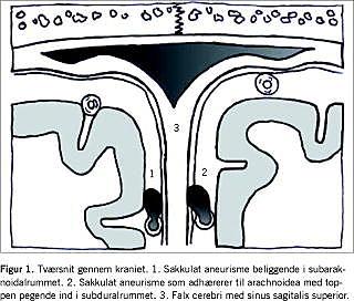 Intrakranielle sakkulate aneurismer er placeret i subaraknoidalrummet og vil ved ruptur give anledning til en subaraknoidalblødning. Ved gennembrud af arachnoideahinden kan blødningsstrømmen finde vej til subduralrummet og give anledning til et subduralt hæmatom. Blandt 641 patienter med subaraknoidalblødning fandtes samtidig subduralt hæmatom i 1,9 procent af tilfældene [1]. Derimod er forekomst af udelukkende subduralt hæmatom som følge af aneurismeruptur ekstremt sjældent. I litteraturen er der hidtil kun beskrevet 24 tilfælde og kun fire tilfælde, hvor aneurismet er placeret på den distale del af arteria cerebri anterior [2].