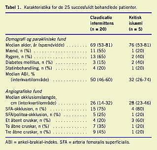 Resultater: Den tekniske succesrate ved behandlingen var 25/28 (89%). Patienter med claudicatio intermittens oplevede symptom-